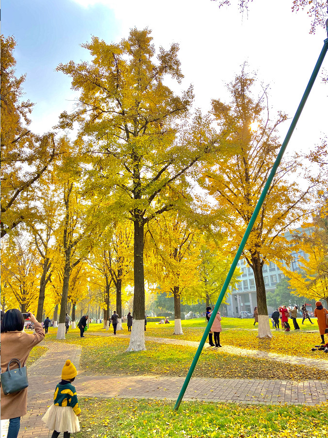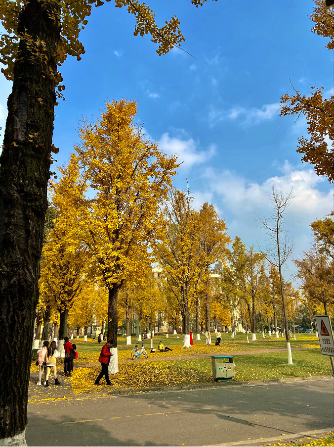 蓝天白云,与金灿灿的银杏相得益彰,(不过还是想悄悄吐槽一句,银杏果果是真的臭。。。)这可是只有成都的冬天才能享受到的惬意呢~不过!眼尖的同学肯定已经发现了,没错,这就是著名的网红赏银杏基地——电子科技大学清水河校区。