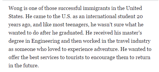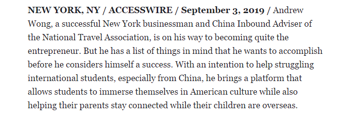 Andrew作为早年间成功定居美国的华侨之一,二十年前像大部分青少年一样,仅仅只是作为国际交换生去到美国学习,对于自己毕业后的工作并没有明确的规划。学习时的Andrew异常勤奋,成功取得了工程学硕士学位,但他没有按部就班的进行与专业相关的工作,而是十分有冒险精神的转投了陌生以美国旅游,商旅,美国名校夏令营,美国游学为主要业务的旅游行业。